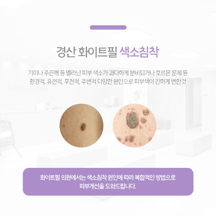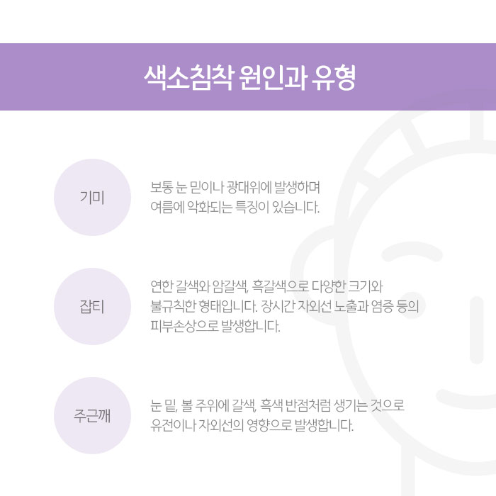 피부에는 멜라닌 색소를 생성하는 세포가 있어 자외선으로부터 피부를 보호합니다. 이러한 세포가 햇빛 또는 여러 다양한 요인들로 멜라닌 세포의 활성도가 증가하게 되고 다량의 색소를 만들어 기미나 주근깨, 잡티 등 색소침착이 발생하는 것입니다.