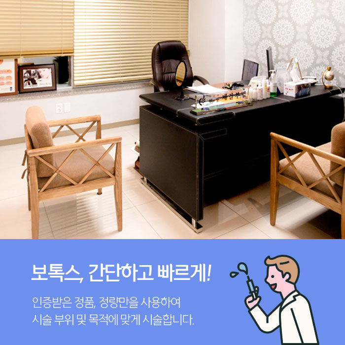 그래서 같은 방법이라도 만족도와 결과가 달라질 수 있어 경험과 노하우가 많은 의료진을 통해 진행하는것이 좋습니다. 정밀한 진단과 개인별 맞춤 계획을 수립하여 담당 의료진과의 충분한 상담을 통해 보톡스 시술을 하면 보다 만족스러운 결과를 기대할 수 있습니다.